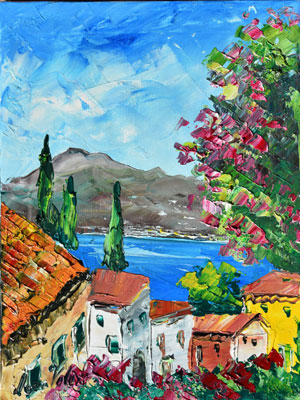 作品番号mar08 マルコ(イタリア) イタリア風景・ガルダ湖沿いの街 油絵