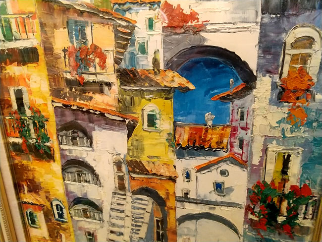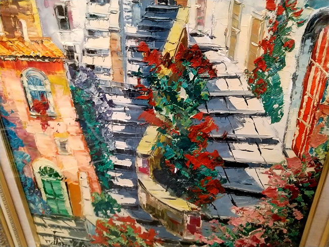 この画家さんの最大の特徴は色の鮮やかさと筆とヘラを使った大胆な構図です。実際に彼の作品を見ていると作品に対する情熱、パワーを感じ取ることができます。