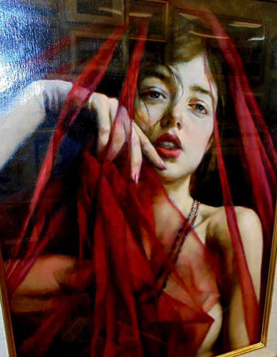 商品番号st06 ストリーノ(イタリア) 赤いベール 油絵 本体サイズ30cm×40cm 額サイズ45cm×55cm 1,000,000円 イタリア人画家ストリーノによる高級感あふれる人物油絵。実物は大変雰囲気のある作品です。 ヨーロッパ画家ならではの独特の構図。素晴らしい油絵です。